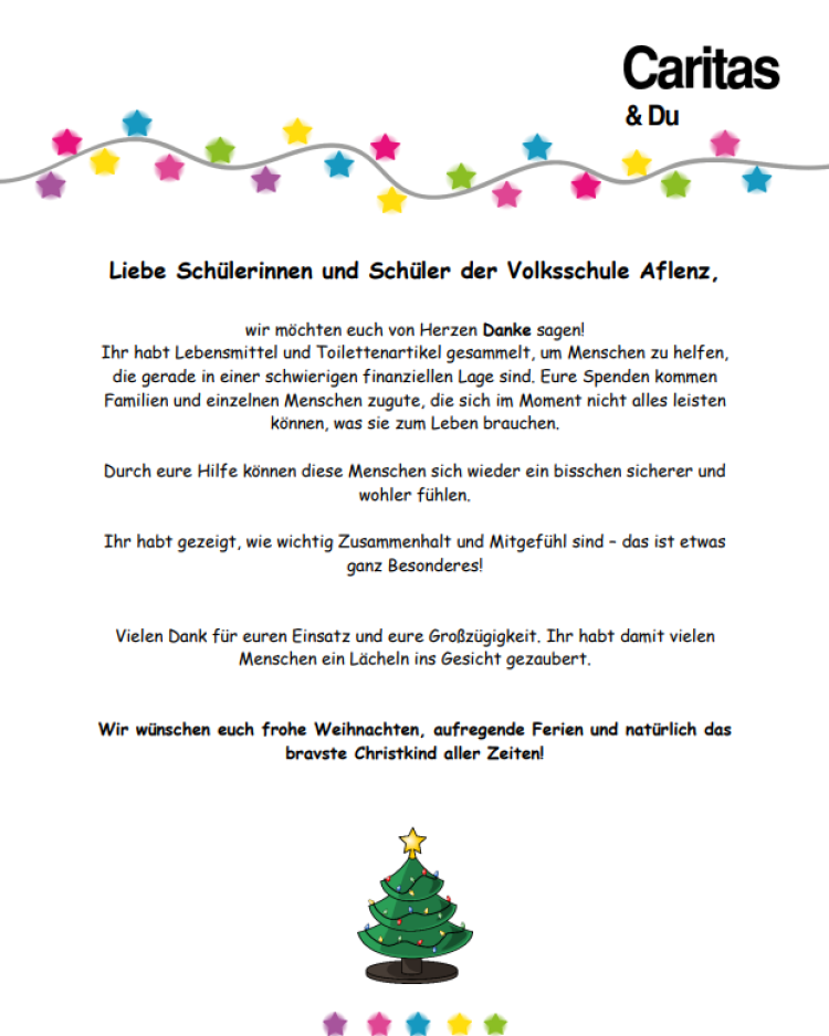 Dieses Jahr sammelte die VS Aflenz in der Weihnachtszeit Lebensmittelspenden und Hygieneartikel für die Caritas-Organisation. Die Kinder, Eltern und Pädagoginnen spendeten fleißig und bereiteten somit vielen Familien, die momentan eine schwierige Zeit erleben, eine schöne Weihnachtszeit! Ein großes Danke an alle Beteiligten!